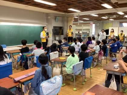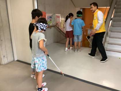 今日は、世田谷区の社会福祉協議会の方が来てくださり、白杖体験を行いました。アイマスクをして、実際に目の見えない方がどんな気持ちで歩いているのかを体験したり、目の見えない人への声掛けの工夫を考えたりしました。「見えないと、こんなに怖いものだと初めて知った。」「こっち、あっちという言葉は、使わずに道を案内するのが難しかった。」「白杖を持っている人を見たら率先して声をかけ、助けてあげたいと思った。」という感想をもちました。
