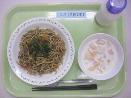 今日の給食は、ソース焼きそば・牛乳・フルーツヨーグルトです。