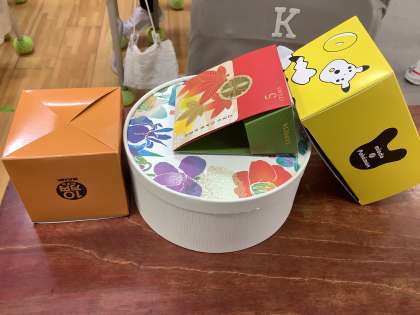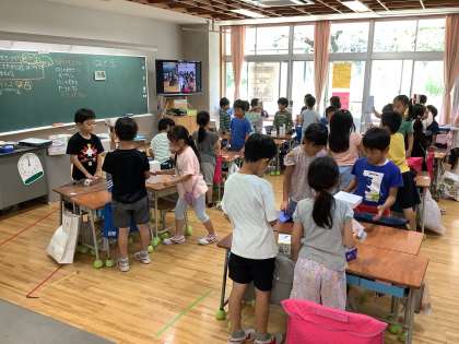 算数「かたちあそび」の学習では、箱を使った活動を行いました。持ち寄った箱を使い、高く積み上げる方法をグループで考えました。大きな箱の上に小さい箱を積み上げたり、平らな面を探してバランスを考えたりするなどの工夫をしていました。最後には、箱を組み合わせて、滑り台やお城などを作ることができました。算数的活動を通して、立体図形の特徴や機能を理解することができました。