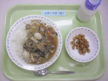 今日の給食は、中華丼・牛乳・大豆とじゃこの甘辛揚げです。