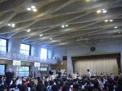 離任された先生と主事さんから、「桜丘小学校の皆さん、感謝の心を忘れないでください。お元気で。」とお別れの挨拶が述べられ、児童は大きな拍手を送って名残を惜しんでいました。