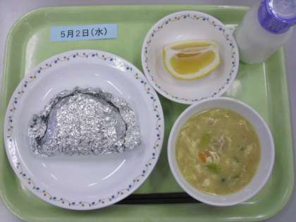 今日の給食は、中華風ちまき・牛乳・中華風コーンスープ・フルーツ(河内晩柑)です。