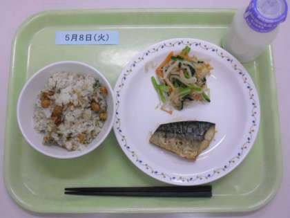 今日の給食は、大豆とじゃこのごはん・牛乳・魚の塩焼き・野菜のからししょうゆかけです。