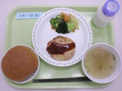 今日の給食は、ショートニングパン・牛乳・豆腐入りハンバーグ・わかめサラダ・コンソメスープです。