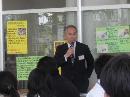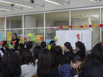 5月12日(土)の土曜授業参観では、3時間目に全クラス道徳の授業公開、その後道徳授業地区公開講座・学校協議会が行われました。講演会では、本校学校関係者評価委員長の稲田正克様を講師に迎え、演題「子どもの心をつかめていますか?」についてお話を伺いました。参加者全員が赤・緑・黄色の三種類の意思表明カードを使っての楽しく、充実した講演会となりました。
