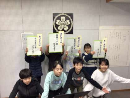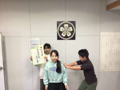 5年生は「あいさつ探検隊」を編成して宣言を行いました。あいさつのよさを見つける探検を通して気付いたことをリズムにのせて発表しました。