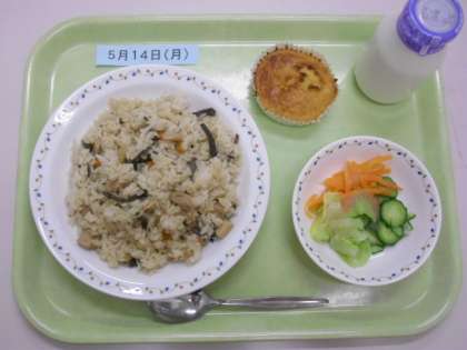 今日の給食は、山菜ピラフ・牛乳・フレンチサラダ・人参カップケーキです。