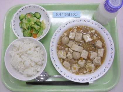 今日の給食は、ごはん・牛乳・豆腐の五目炒め・野菜のごま風味です。