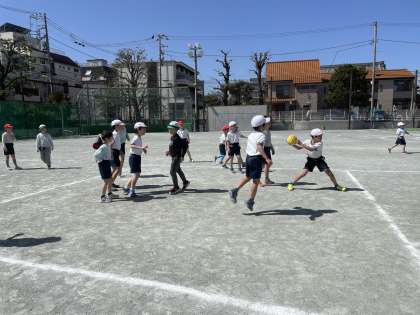 最後はクラスを半分に分けたチームで、クラス対抗ドッジボール大会を行いました。ボールを取ったり投げたり、隅の方まで逃げたりなど思い思いに動くことができました。