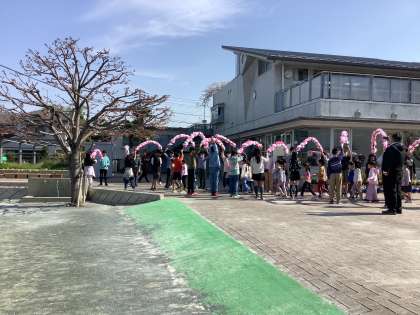 代表児童の用意した花のアーチを通って嬉しそうに校庭に入ってくる1年生。