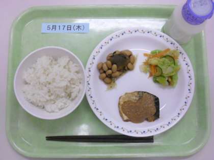 今日の給食は、ごはん・牛乳・魚のごまだれかけ・即席漬・こんぶ豆です。