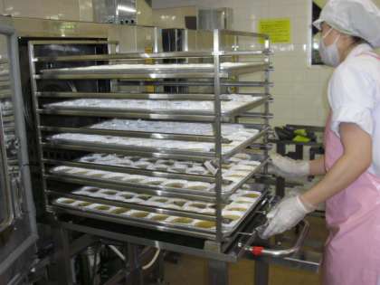 学校では、スチームコンベクションオーブンという、焼く、蒸し焼き、蒸すという機能がある調理機器を使用しています。