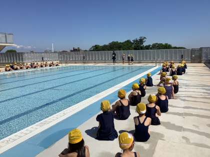 よいお天気に恵まれ、プール開きを行うことができました。初めて見た大きなプールに目を輝かせていました。プールサイドでは、ルールを「かぶとむし」で確認しました。
