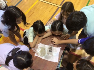 水道水源林をモデルにした土の感触に触れたり、浄水場で行っている過程の一部分を実験したりしました。