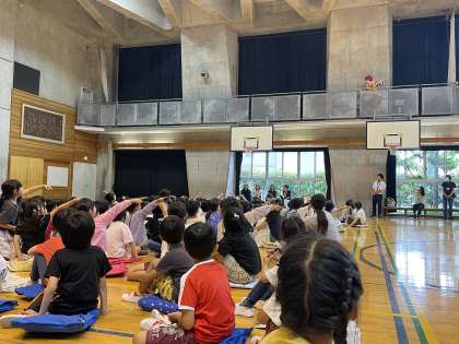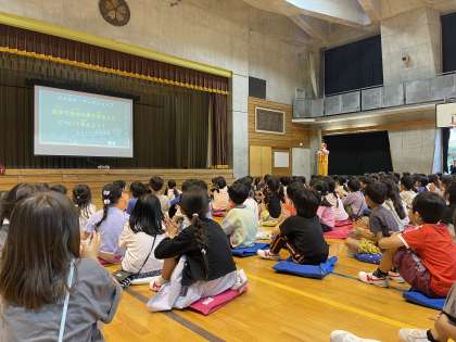 今日の3時間目は、千歳船橋店のマクドナルドの店長さんたちが桜丘小学校に来てくれました。そして、スペシャルゲストにドナルド・マクドナルドも来てくれました!子どもたちの「うわー!」という歓声が体育館に響き渡りました。