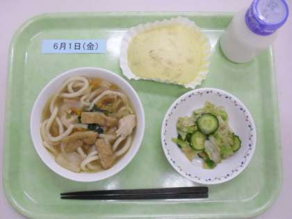 今日の給食は、きつねうどん・牛乳・きゃべつときゅうりのごま酢和え・りんご入り蒸しパンです。