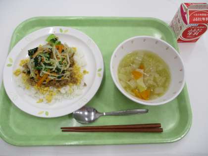 【今日の献立】 ・ツナの三色丼 ・吉野汁 ・牛乳