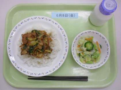 今日の給食は、かき揚げ丼・牛乳・ひとしお野菜です。