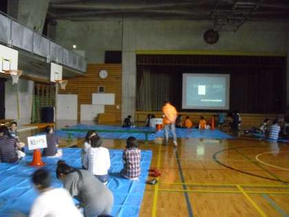 続いて「災害時の避難方法、避難所とは」について講演を聞き、その後4つの班に分かれて訓練を行いました。