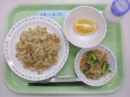 今日の給食は、ナシゴレン・牛乳・春雨サラダ・フルーツ(オレンジ)です。