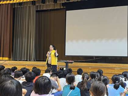 1時間目には、視覚障害者にも全盲と弱視があること、介助するには半歩先を歩くこと、「あと5歩で階段を上ります。」のように具体的な声掛けが大切だということを教えてもらいました。