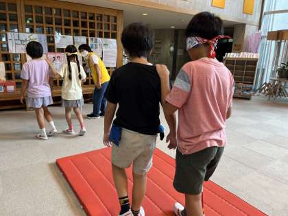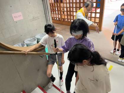 2時間目からは、3人一組になり、バンダナやアイマスクで目隠しをし、階段の上り下りや障害物を避けて通る体験をしました。