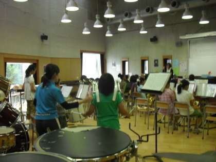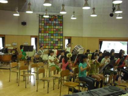 ブラスバンドクラブは、クラブ活動の時間のほかに、毎週月曜日と木曜日に朝練習をしています。今は、7月21日の「経堂まつり」にむけて練習をしています。