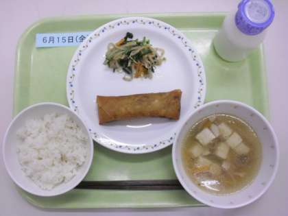 今日の給食は、ごはん・牛乳・春巻き・炒めナムル・ザーサイスープです。