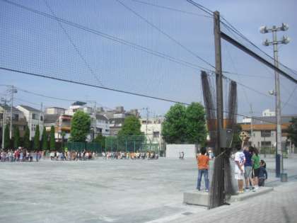 1〜3年生は、校庭で「サイコロ当てゲーム」をしました。サイコロの目の数を予想して1〜6までの数字の陣地の中に移動します。集会委員がサイコロを投げて、「サイコロの目は6です。」と発表すると、当たった児童は「やったー!」と喜んでいました。