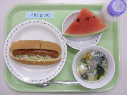 今日の給食は、セルフウィンナーサンド・牛乳・野菜スープ・フルーツ(すいか)です。