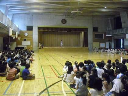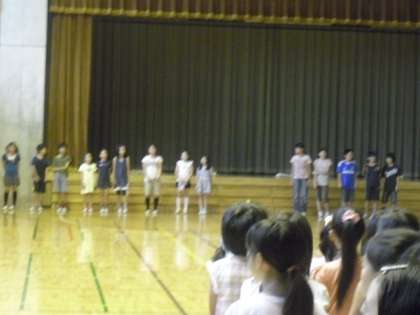 全校児童が体育館に集まり、「ハッピーバースデー」を歌いました。