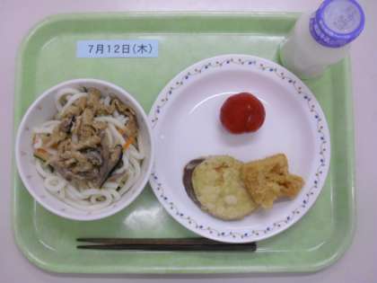 今日の給食は、五目冷やしうどん・牛乳・天ぷら(いか、さつま芋)・フルーツ(プラム)です。