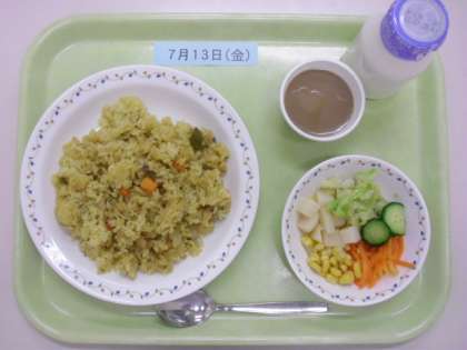 今日の給食は、カレーピラフ・牛乳・ポテト入りフレンチサラダ・カフェオーレゼリーです。