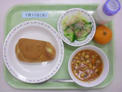 今日の給食は、ダイスチーズパン・牛乳・ポークビーンズ・グリーンサラダ・フルーツ(冷凍みかん)です。