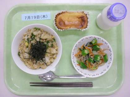 今日の給食は、ひつまぶし・牛乳・おくらともやしの煮びたし・お楽しみデザート(ベイクドチーズケーキ)です。
