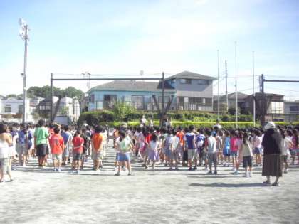 9月10日、晴れ渡る空の下で全校朝会が行われました。校長先生からは、世田谷区の大会と絵画コンクールで入賞した児童の表彰がありました。