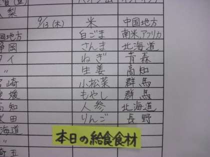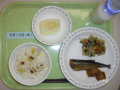 今日の給食は、さつま芋ごはん・牛乳・さんまのしょうが煮・野菜のからししょうゆかけ・フルーツ(りんご)です。