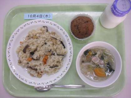 今日の給食は、山菜ピラフ・牛乳・ABCスープ・おからマフィンです。
