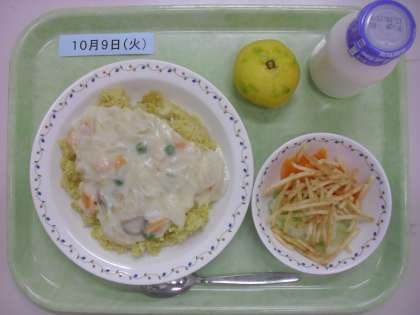 今日の給食は、ドリア風・牛乳・じゃが芋のハニーサラダ・フルーツ(みかん)です。