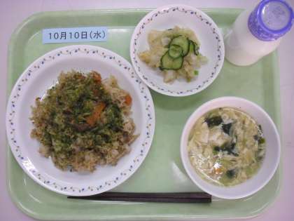 今日の給食は、そばめし・牛乳・かき卵汁・きゃべつときゅうりのごま酢和えです。