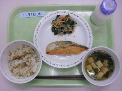 今日の給食は、大豆とじゃこのごはん・牛乳・魚のみそマヨネーズ焼き・野菜のごま和え白滝入り・すまし汁です。