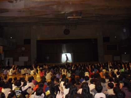今日の集会は「シルエットクイズ」です。今回はスポーツをテーマに、身振り手振りやボールなどの影を見てどんなスポーツかを当てました。