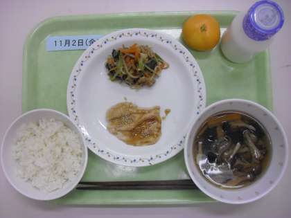 今日の給食は、ごはん・牛乳・蒸しどり・煮びたし・きのこ汁・フルーツ(みかん)です。