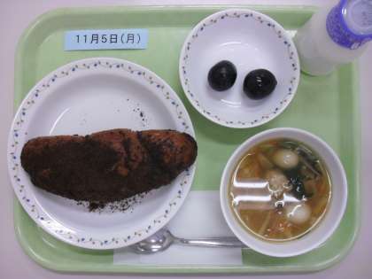 今日の給食は、揚げパン(ココア)・牛乳・肉団子入り春雨スープ・フルーツ(ピオーネ)です。