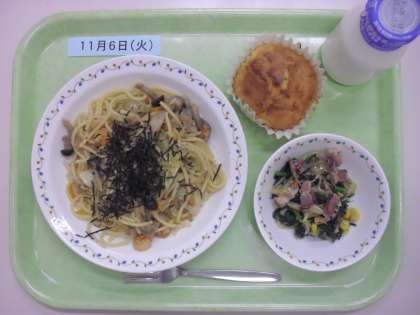 今日の給食は、和風スパゲティー・牛乳・ほうれん草サラダ・りんごマフィンです。