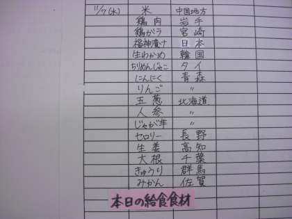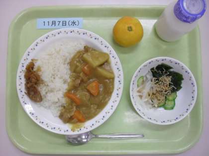 今日の給食は、チキンカレーライス・牛乳・福神漬け・じゃこサラダ・フルーツ(みかん)です。