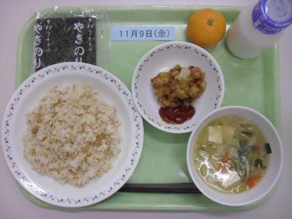今日の給食は、手巻きずし・牛乳・大豆とコーンのフリッター・みそ汁・フルーツ(みかん)です。