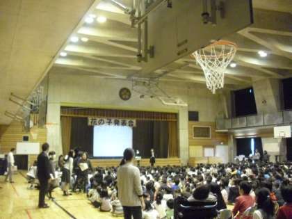 花の子発表会用にいすやマットが並べられた体育館で、本番の雰囲気を感じながら練習しました。