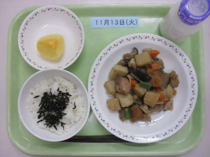 今日の給食は、ごはん・牛乳・ひじきふりかけ・いろどり煮・フルーツ(柿)です。