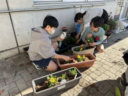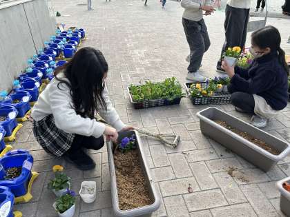 栽培委員会では、花の苗をレンガ広場のプランターに植えました。
